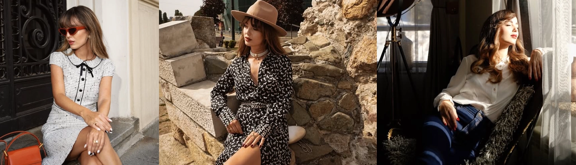 შავი ტვიდის ბლუზა თეთრი მრგვალი ყელით